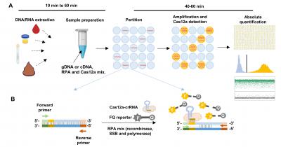 The team uses extracted DNA/RNA of the sample and divides a 15 μL reaction into thousands of independent partitions. In each partition, the DNA/RNA is amplified and identified by Cas12a protein, an enzyme that can turn the target signal into a fluorescent signal. This allows absolute quantification to be achieved by counting the number of partitions that have the target DNA/RNA and are lit up.