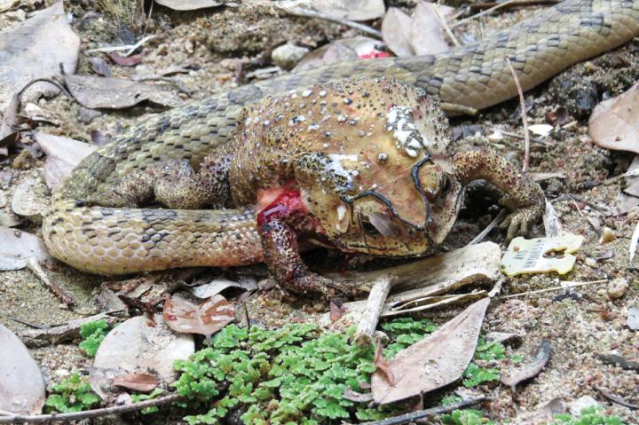 The toads observed belong to the quite common species called Asian Black-spotted Toad (Duttaphrynus melanostictus), which is known to secrete a potent toxin from their prominent parotid glands, located on the neck. Could it be that the snakes have adopted this sophisticated and gruesome approach to avoid being poisoned?