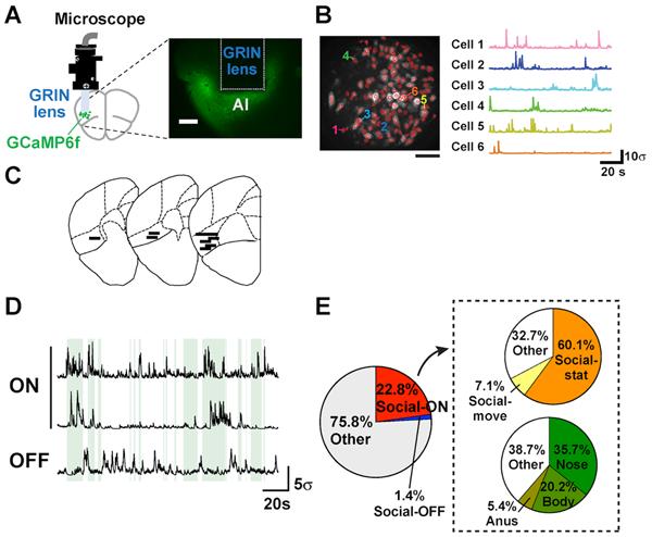 image: A. Imaging using a miniaturized fluorescence microscope. B. Changes in GCaMP6f fluorescence in six cells. C. Reconstructed images of the GRIN lens implanted in the AI. D. Traces of 2 Social-ON cells and 1 Social-OFF cell. E. Pie charts showing the subcategories of neurons.