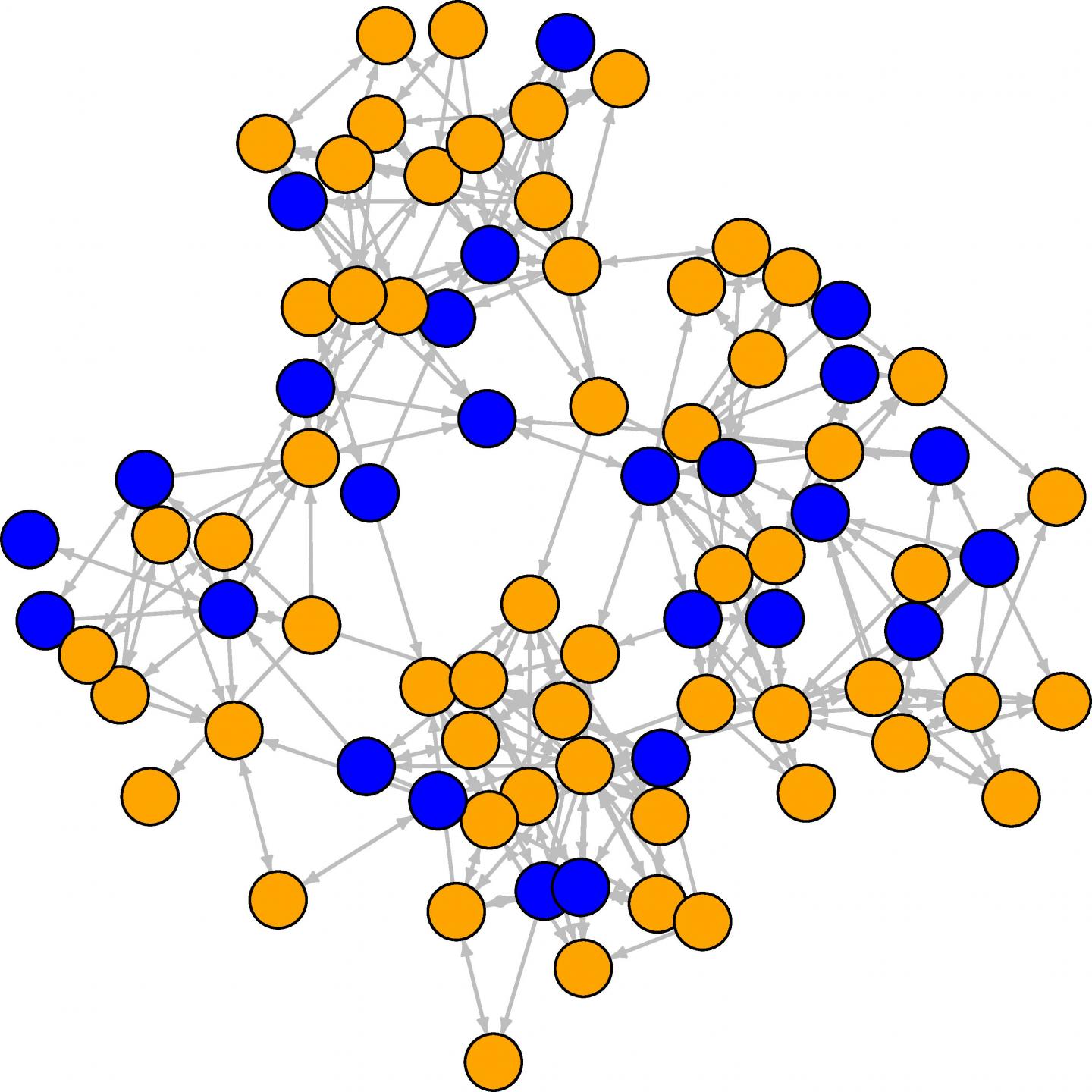 image: The orange nodes are females, the blue nodes are males. Ties are directed friendship connections between students.