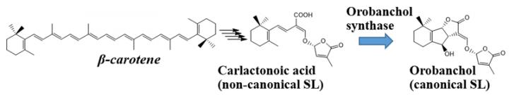 image: Figure 1: Diagram showing the biosynthesis of orobanchol from β-carotene:
