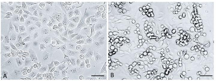 image: Caption Pancreatic cancer cells in control (A) vs treatment by anti-sortilin targeting drug (B). When sortilin is targeted, pancreatic cancer cells partially lose attachment and cannot migrate. Scale bars = 50um.