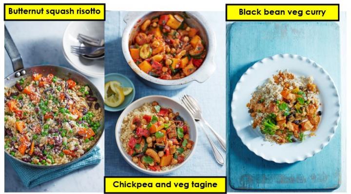 image: These meals are examples of vegetarian meals that help build muscle proteins because they consist of a complementary and complete profile of all essential amino acids.