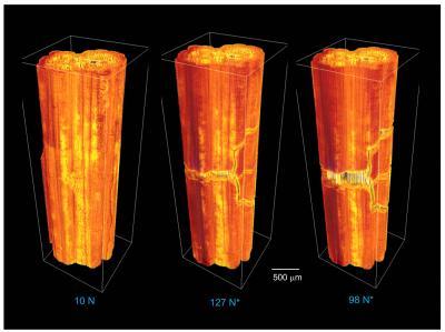 These CT scans showing the formation of microcracks in ceramic composites under applied tensile loads at 1,750 degrees Celsius were obtained at Berkeley Lab's Advanced Light Source through the use of a unique mechanical testing rig.