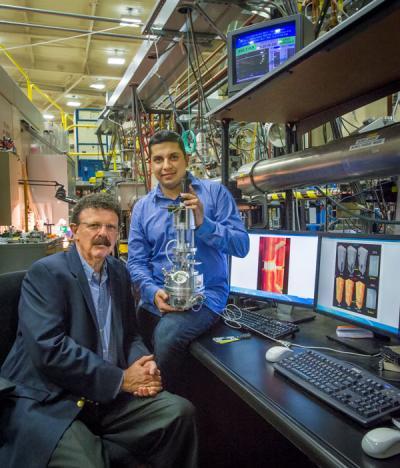 Robert Ritchie (left), Lawrence Berkeley National Laboratory, and Hrishikesh Bale, Lawrence Berkeley National Laboratory, are pictured at ALS Beamline 8.3.2 with the mechanical testing rig they developed for in situ ultrahigh temperature X-ray computed microtomography.