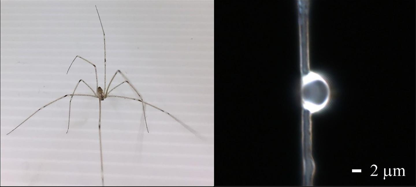 The authors collected smooth, uniform dragline silk from Pholcus phalangioides spiders, commonly known as daddy longlegs, and dripped a resin onto the silk fiber. As the resin condensed on the fiber, the wetting properties of the silk naturally formed it into a dome shape, which they found could be used as an optical lens. The mechanical and optical properties of the silk also make it ideal for supporting the lens.