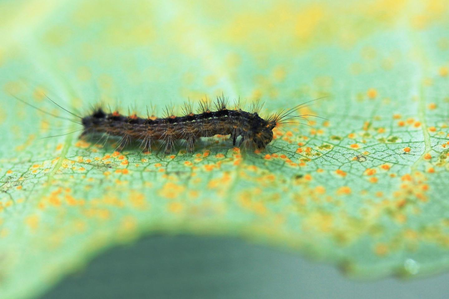 image: A gypsy moth caterpillar (Lymantria dispar) relishing the spores of Melampsora larici-populina a rust fungus that has spread on a poplar leaf. The new study shows that the insect is not only herbivorous, but also fungivorous, that is, likes to feed on nutrient-rich fungi.