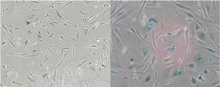 image: Brightfield microscopy images of senescent lung fibroblasts (left) and senescent renal epithelial cells (right). Blue staining of the cells is an indicator of senescence-associated beta-galactosidase activity, a marker present only on senescent cells.