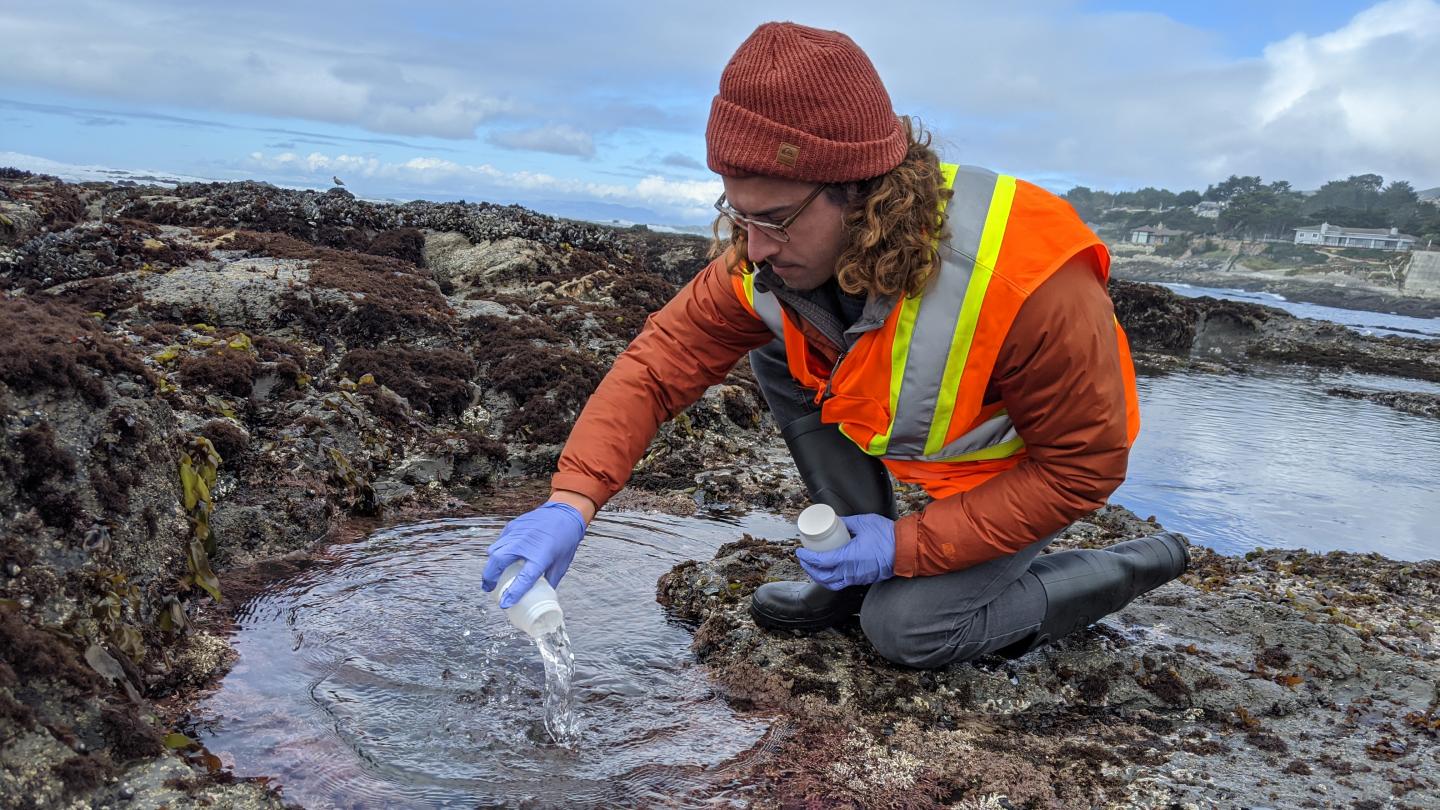image: Stanford researcher Ryan Searcy collects water samples from a tide pool at the Fitzgerald Marine Reserve, in Moss Beach, California.