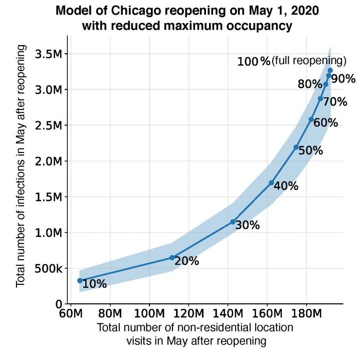 image: A new computer model predicts the COVID-19 infection-versus-activity trade-off for Chicago. According to the figure, COVID-19 infections will rise as the number of visits to businesses and public places approach pre-pandemic levels. However, restricting maximum occupancy can strike an effective balance: for example, a 20 percent occupancy cap would still permit 60 percent of pre-pandemic visits while risking only 18 percent of the infections that would occur if public places were to fully reopen.