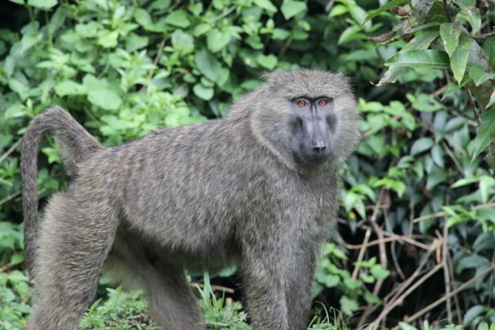 image: An Olive baboon outside the Kibale EcoHealth Project lab at Makerere University Biological Field Station in Uganda's Kibale National Park.