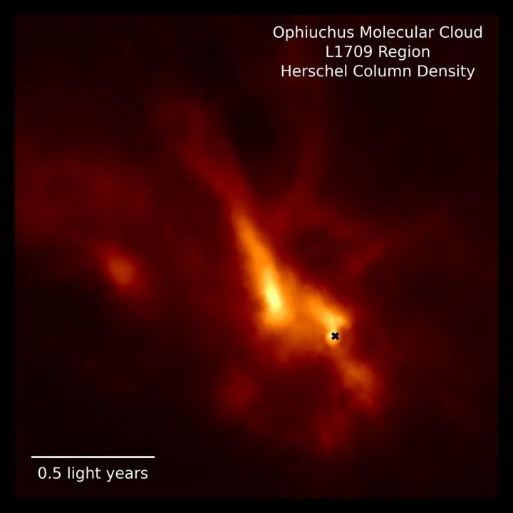 image: The dense L1709 region of the Ophiuchus Molecular Cloud, mapped by the Herschel Space Telescope, which surrounds and feeds material to the much smaller IRS 63 proto-star and planet-forming disk (location marked by the black cross).
