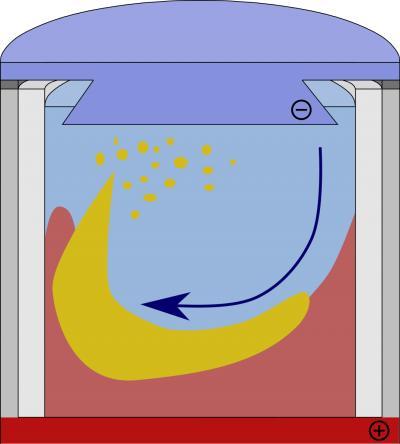 The basic principle behind a liquid-metal battery is quite simple: since liquid metals are conductive, they can serve directly as anodes and cathodes. When one pours two suitable metals into a container so that the heavy metal is below and the lighter metal above, and then separates the two metals with a layer of molten salt, the arrangement becomes a galvanic cell. The metals have a tendency to form an alloy, but the molten salt in the middle prevents them from direct mixing. Therefore, the atoms of one metal are forced to release electrons. The ions thus formed wander through the molten salt. Arriving at the site of the other metal, these ions accept electrons and alloy with the second metal. During the charging process, this process is reversed and the alloy is broken up into its original components. In order to avoid the Tayler instability within big batteries – meaning a short circuit – Stefani suggests an internal tube through which the electrical current can be guided in reverse direction. This allows the capacity of the batteries to be considerably increased.