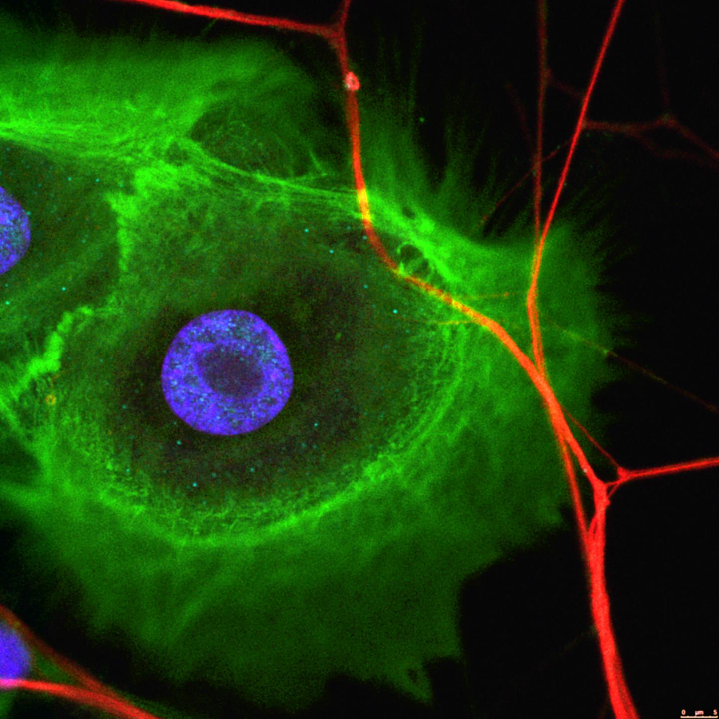 image: Cancer cells (green) are innervated with nerve cells (red). The cell nuclei (blue) are also visible.