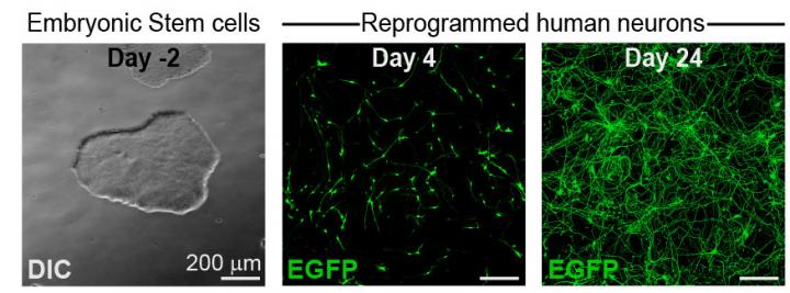 image: Human neurons reprogrammed from embryonic stem cells at various stages of development.