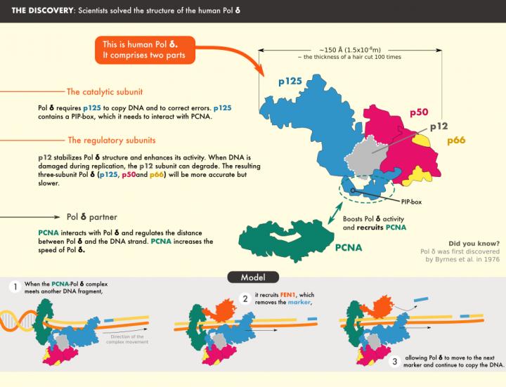 During replication, the two strands in the DNA helix are unwound, and each serves as the template for a new copy. Pol δ is one of the enzymes responsible for copying one of the strands. It is tethered to the DNA by a molecule known as PCNA, forming a Pol δ-DNA-PCNA complex at the heart of replication.