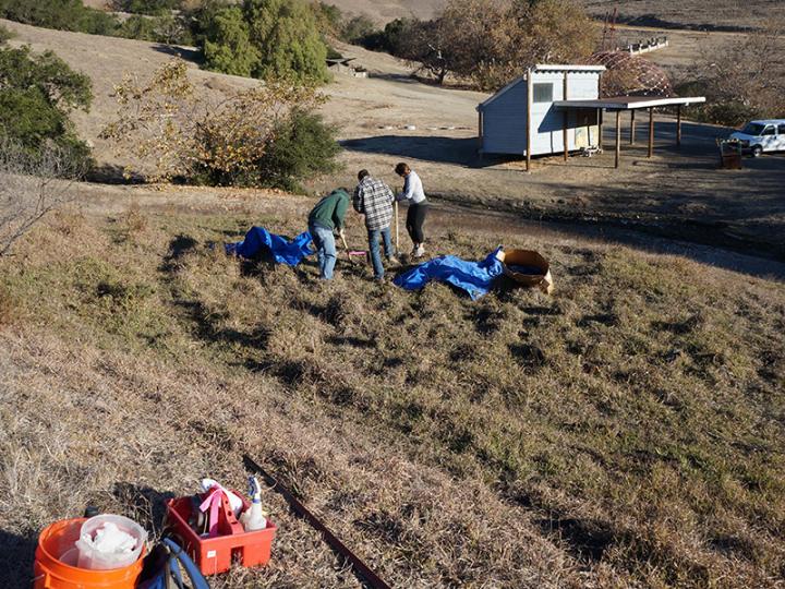 image: Researchers work together to dig a soil pit in a slump block wetland in Poly Canyon along the central coast of California.