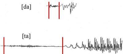 The waveforms of two similar sounding syllables "ta" and "da" allow researchers to make precise time measurements and comparisons of speech production.