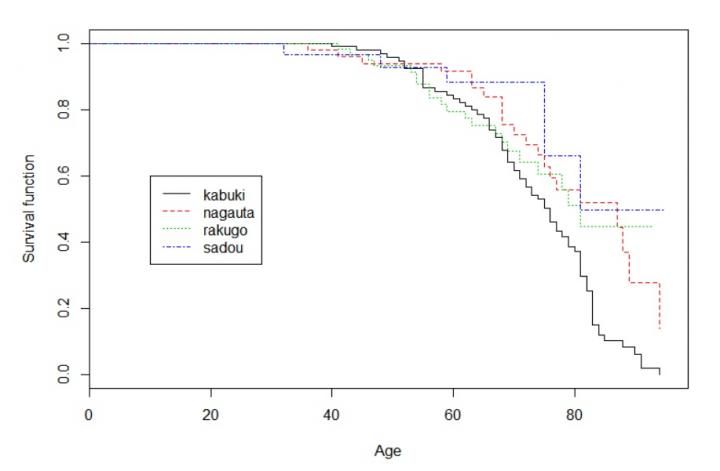 Using a method called Kaplan-Meier analysis[1], they found that contrary to expectations, the lifespan of Kabuki actors was shorter than that of the other three types of traditional artists.