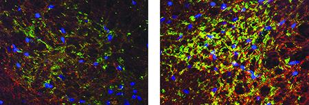 image: In this microscopic view of rat spinal cord injury models, you can see a large abundance of neural progenitor cell-derived axons emerging when the cells are preconditioned with modified tPA stroke drug (right) than in those who received unconditioned cells (left).