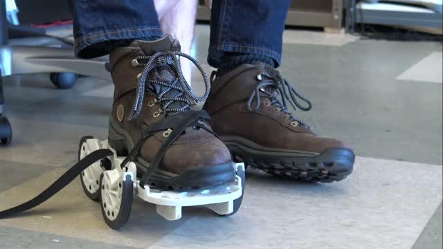 video: The iStride device is strapped over the shoe of the good leg and generates a backwards motion, exaggerating the existing step, making it harder to walk while wearing the shoe. The awkward movement strengthens the stroke-impacted leg, allowing gait to become more symmetrical once the shoe is removed.