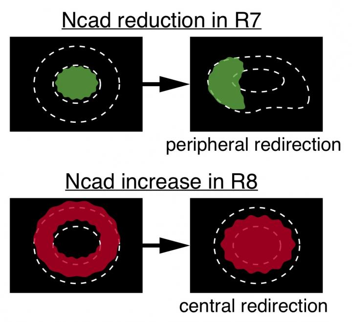 image: When Ncad expression and adhesiveness were reduced in R7, which is usually situated at the central core region of the column, R7 terminals were redirected to the peripheral region of the column (top). In contrast, artificial increase of Ncad expression level and adhesiveness of R8 caused its redirection toward the central core region of the column (bottom).