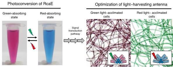 Certain cyanobacteria can change the absorbing light colors for photosynthesis using a green- and red-light sensing photosensor protein. A Japanese research group elucidated the molecular structure of RcaE, a representative member of the photosensors. They revealed the unique conformation of the bilin chromophore and the unique protein structure that potentially functions as a proton transfer route to bilin. They also demonstrated that RcaE undergoes protonation and deprotonation of the bilin chromophore during the green and red photoconversion. These results provide insights into how cyanobacteria evolved photosensors with diverse spectral sensitivities and contribute to the development of new photoswitches of gene expression.
