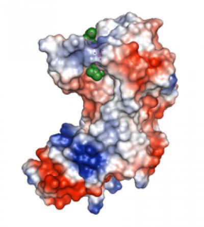 This is a 3-D model of the outside surface of the enzyme that helps M. tuberculosis bacteria resist common antibiotics. Blue indicates positively charged atoms; red indicates negatively charged atoms. A peptidoglycan (green) is bound inside the enzymes active site.