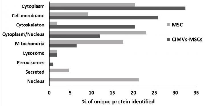 image: Proteome analysis of human MSCs and CIMVs-MSCs. Venn diagram of identified proteins MSCs and CIMVs-MSCs (A). Distribution of the identified proteins in organelles, % of unique identified proteins (B).