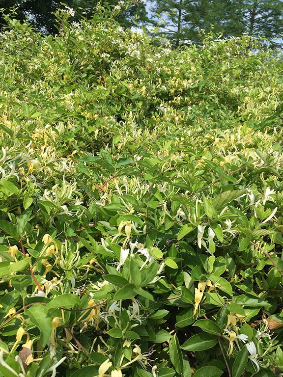 image: Shown is the invasive weedy plant Lonicera japonica Thunb., commonly known as Japanese honeysuckle. This plant, a member of the Caprifoliaceae family, is native to east Asia and introduced into many countries around the world, including the US. It is a perennial vine that produces fragrant flowers and overtops other plants, reducing light available for native species. Increases in atmospheric CO2 may favor introduced weeds such as L. japonica. This picture was taken at the edge of a patch of woodland in a park in Newark, Delaware.