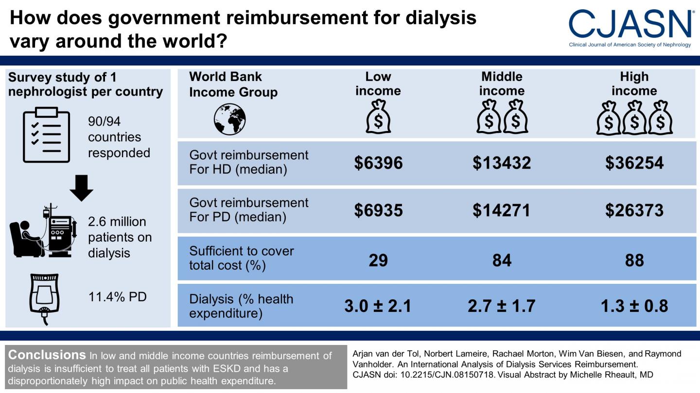 Washington, DC (December 13, 2018) -- A new study has examined how countries around the world compare in providing reimbursement for dialysis care received by patients with kidney failure. The findings, which appear in an upcoming issue of the Clinical Journal of the American Society of Nephrology (CJASN), may help government officials make dialysis reimbursement more equitable and sustainable.