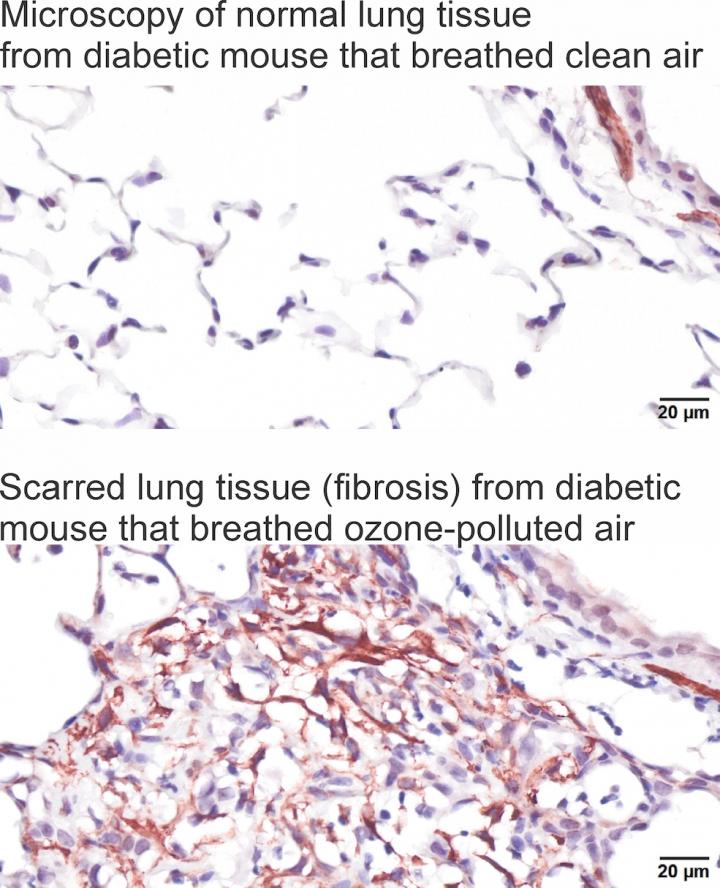 "Our results propose a causal link for ozone exposure to preferentially promote early pulmonary fibrosis and interstitial lung disease in pre-diabetic mice. We only exposed these mice for three weeks, but there are millions of people living in cities like Los Angeles and New York who are exposed to high levels of ozone day after day," he said. "Then, you must consider the prevalence of pre-diabetes people--approximately 33% in this country. Our study results suggest that people who are borderline insulin resistant--or diabetic--and living in areas with high levels of ozone pollution might be at an increased risk for developing interstitial lung disease."