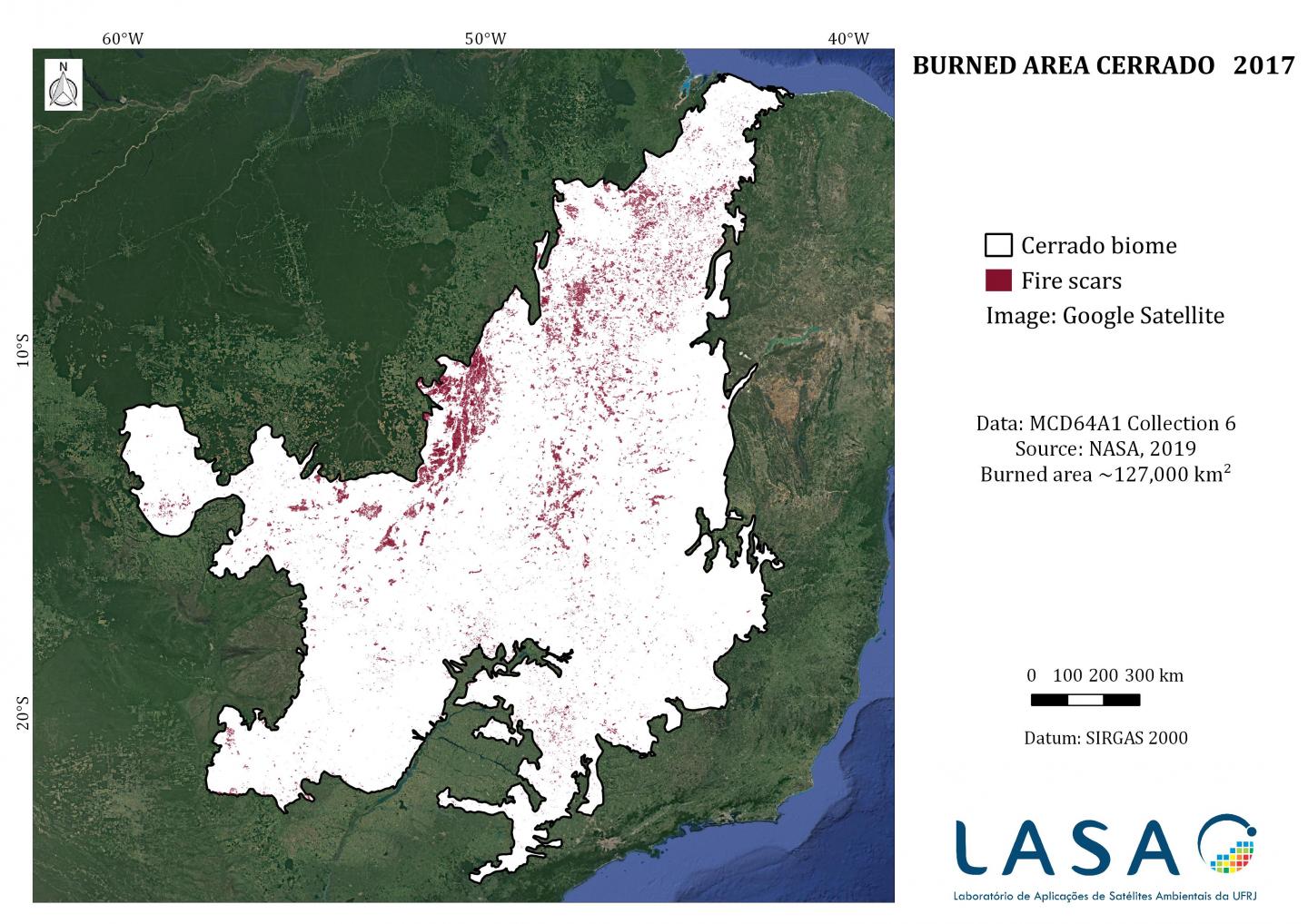 image: The image produced by the scientists involved in the project shows fire scars throughout the Cerrado on the basis of 2017 data.