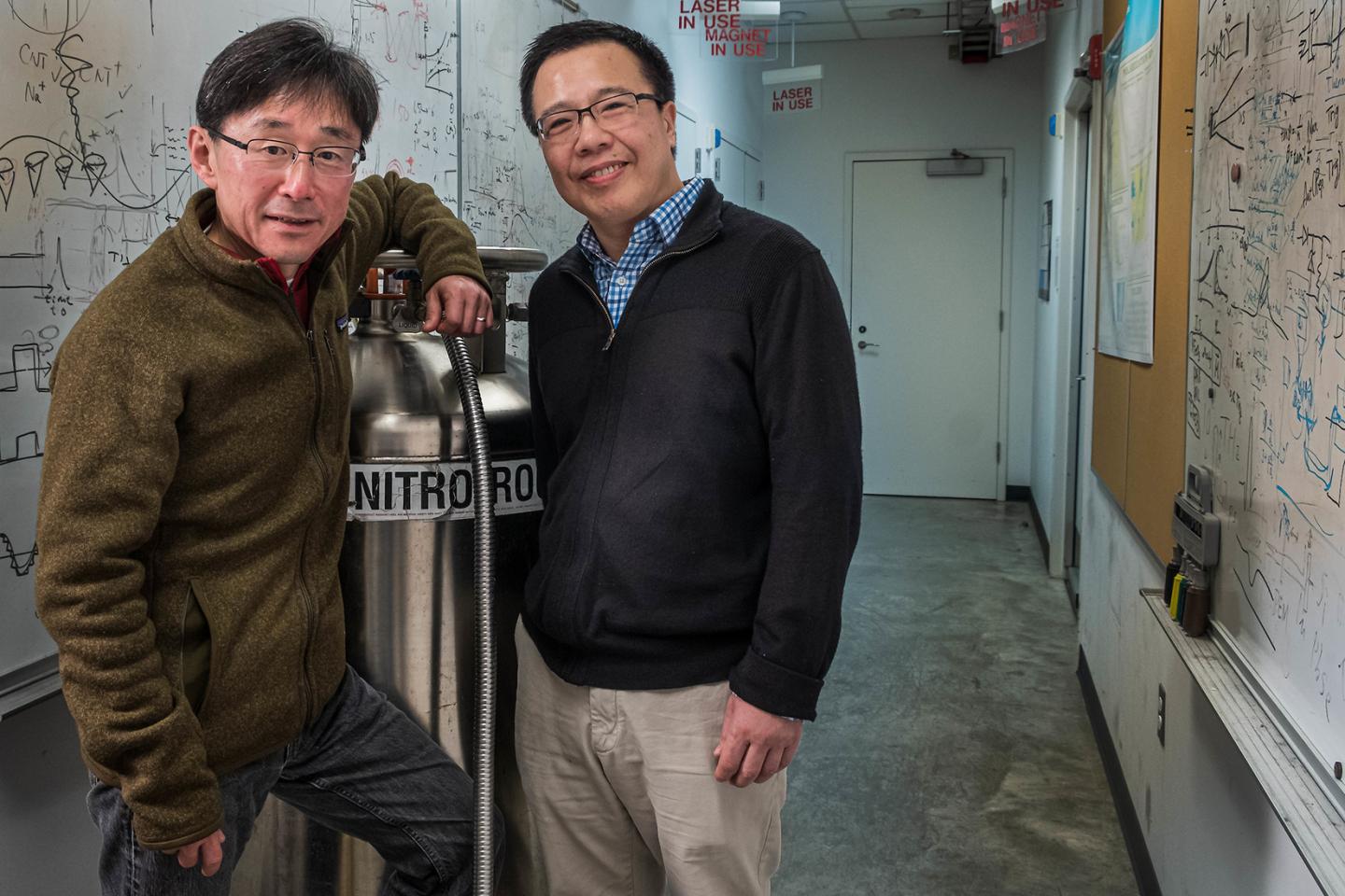 image: Junichiro Kono (left) and Qimiao Si in Kono's Rice University laboratory in December 2019.