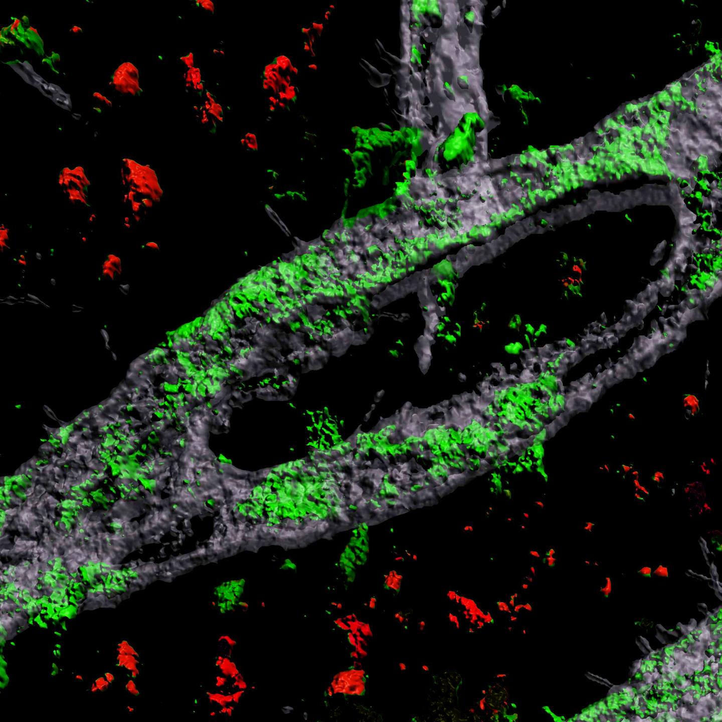 image: A 3D rendering of a lab-grown blood brain barrier carrying the APOE4 gene variant shows a heavy accumulation of amyloid on the vessel (green).
