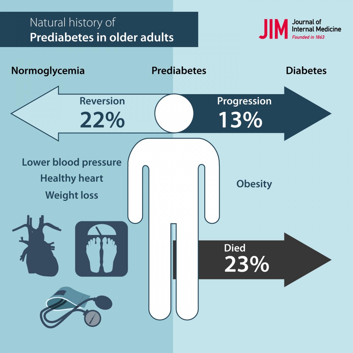 image: In a Journal of Internal Medicine study that followed older adults with prediabetes for 12 years, most remained stable or reverted to normal blood sugar levels, and only one-third developed diabetes or died.
