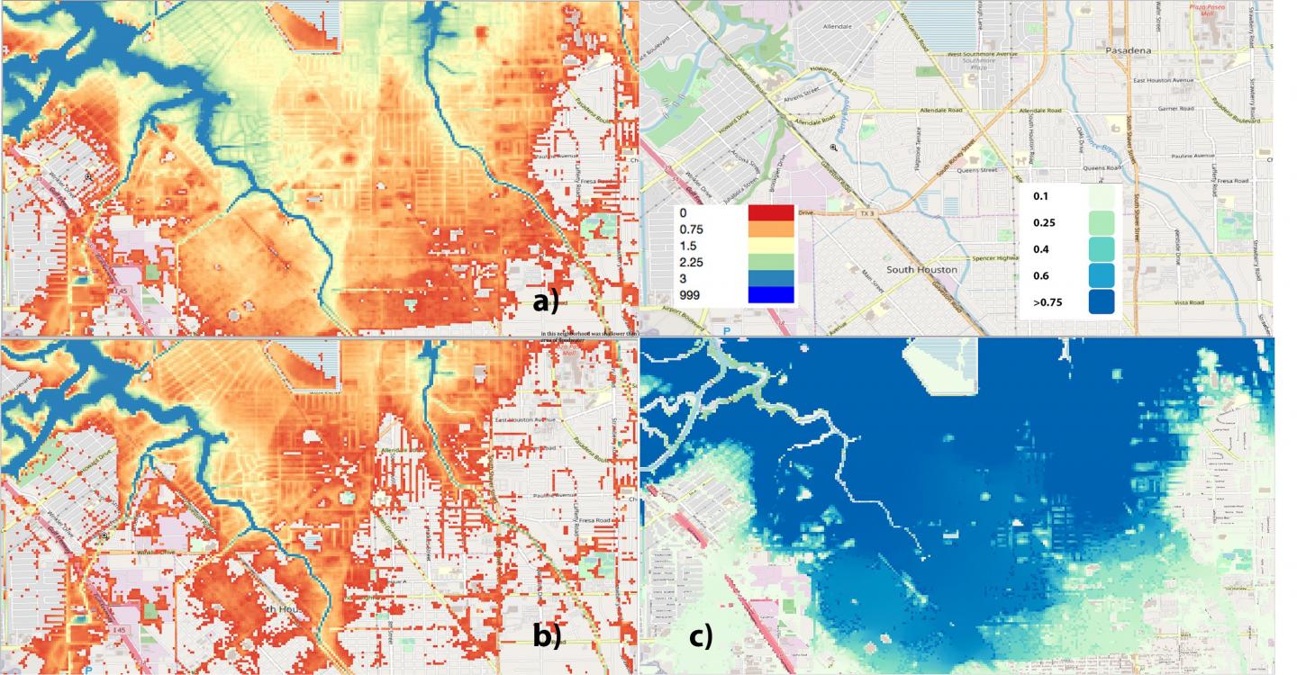 image: Top left (a): Simulation of the actual flood depth (meters) in a South Houston neighborhood. Bottom left (b): Simulation of the counterfactual flood if climate change increased precipitation by 38%. Bottom right (c): Attributable increase in flood depth (meters) if climate change increased precipitation by 38%.