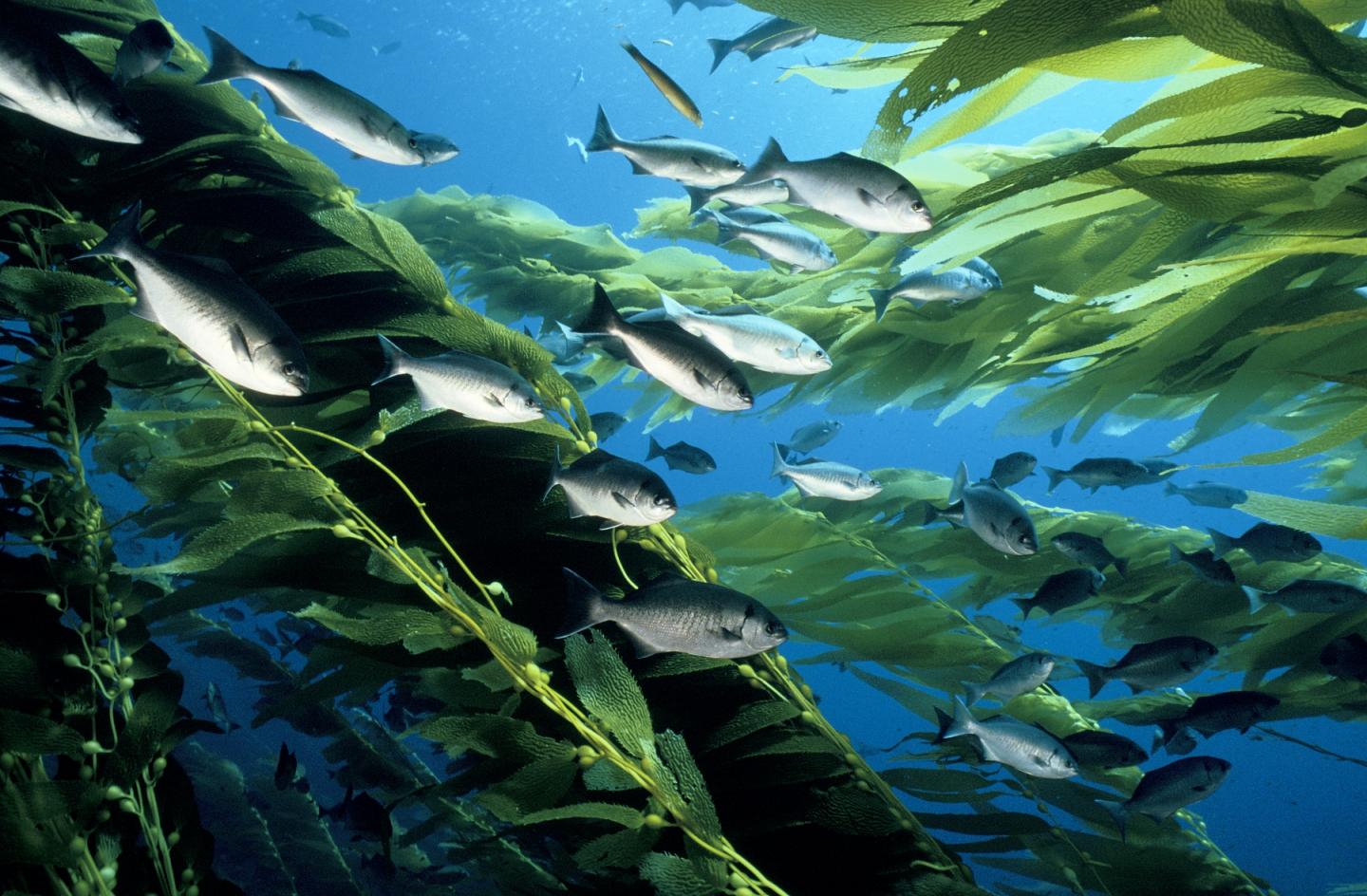 image: Kelp forests provide habitat for a diverse array of sea life, from finfish and shellfish to corals and sponges. Such biodiversity could change if ocean storms become more frequent.