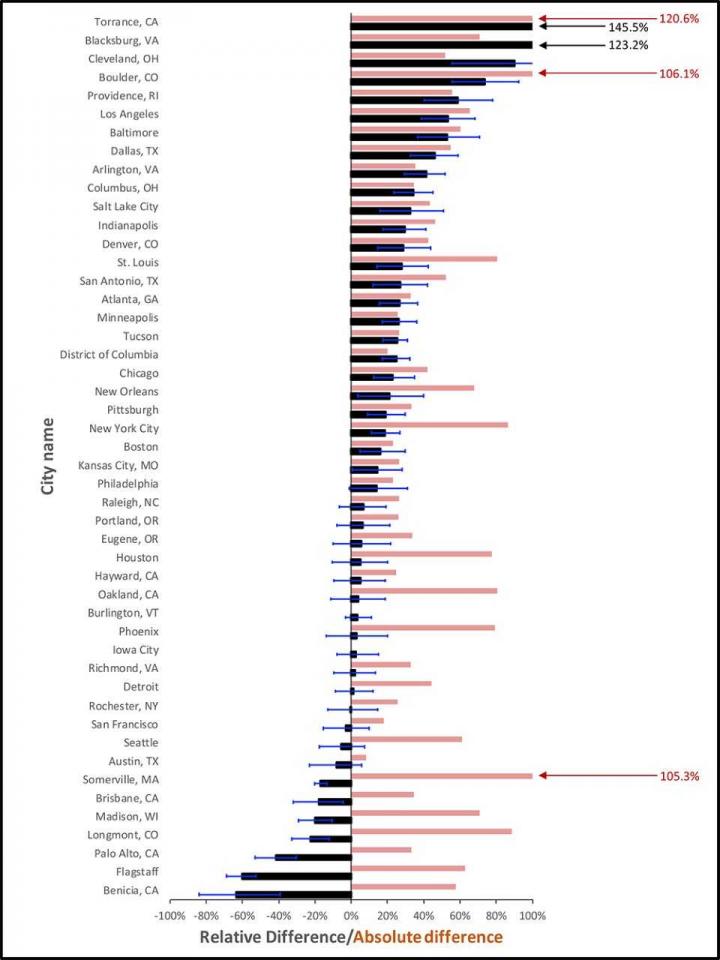 image: Graph shows differences between U.S. cities' estimates of their greenhouse gas emissions as compared to estimates generated through the standardized Vulcan emissions system