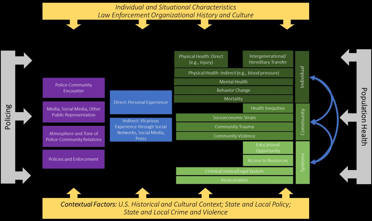 "This model shows how different types of encounters with policing can affect population health at multiple levels, through different pathways, and that factors like community characteristics and state and local policy can play a role," said Simckes, who currently works for the Washington State Department of Health.