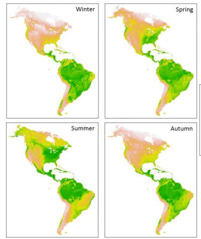 The "green wave" of maturing and dying vegetation is plainly visible in this animation based on data from the MODIS imaging sensors onboard the Terra and Aqua satellites. Vegetation greenness in Central and South America remains relatively stable except in the eastern portion of the continent. Animation by Frank La Sorte, Cornell Lab of Ornithology.