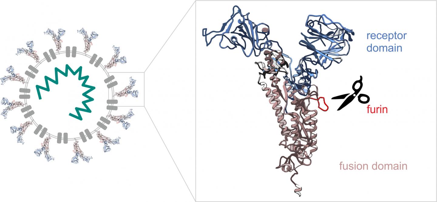 One protein the SARS-CoV-2 spike protein addresses is the enzyme furin that is present in many cells of the human body. Furin's task is to cleave proteins, acting like biological scissors. Different enzymes affect different proteins. Among other proteins, furin also cleaves the SARS-CoV-2 spike protein, removing its detector-like tip. After that, the remaining part of the spike protein starts work by fusing with the cell membrane and allowing the virus to enter the cell.