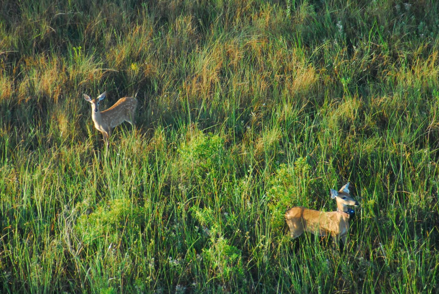 image: These two white-tailed deer, a fawn on the left and a female wearing a GPS collar on the right, were observed during an aerial survey in Florida's Big Cypress National Preserve. Photo by Elina Garrison, Florida Fish and Wildlife Conservation Commission.
