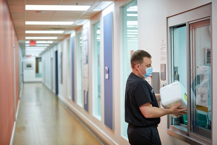 image: Emergency medicine physician Philip Mudd, MD, PhD, carries an icebox containing COVID-19 samples. Mudd led a study at Washington University School of Medicine in St. Louis that showed that, contrary to expectation, most people with severe COVID-19 do not suffer from unbridled inflammation. The findings suggest that anti-inflammatory therapies may not be helpful for most COVID-19 patients.