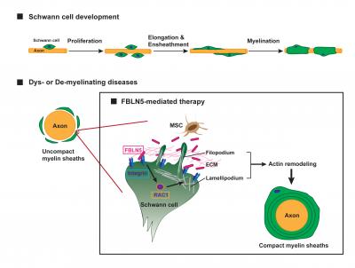 "We were able to show that co-culture with WJ-MSCs or treatment of recombinant FBLN5 promotes the proliferation of Schwann cells through ERK activation, whereas FBLN5-depleted WJ-MSCs do not. We further revealed that during myelination of Schwann cells, FBLN5 binds to Integrin and modulates actin remodeling. At the same time, we discovered that FBLN5 effectively restores the myelination defects of Schwann cells," Dr. Lee said.