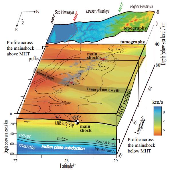 image: The velocity model showing a map view of the MHT and a cross-section passing through the Gorkha earthquake