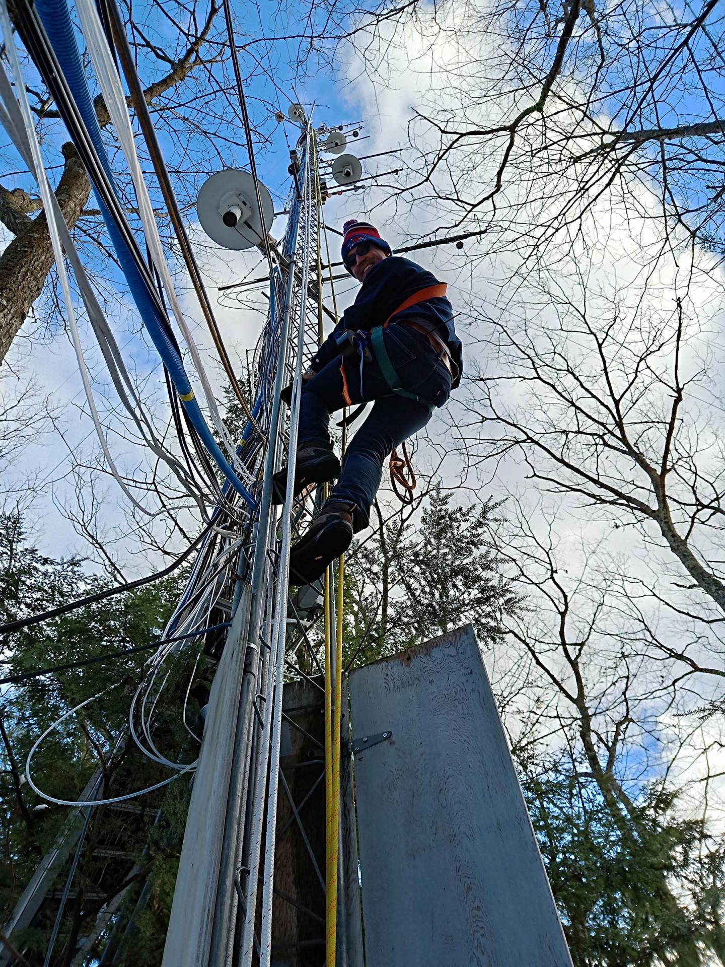 image: UMass Lowell Prof. Daniel Obrist, chair of the Department of Environmental, Earth and Atmospheric Sciences, climbs an observation tower in Harvard Forest in Petersham, Mass., to service instrumentation measuring mercury deposition at the site.
