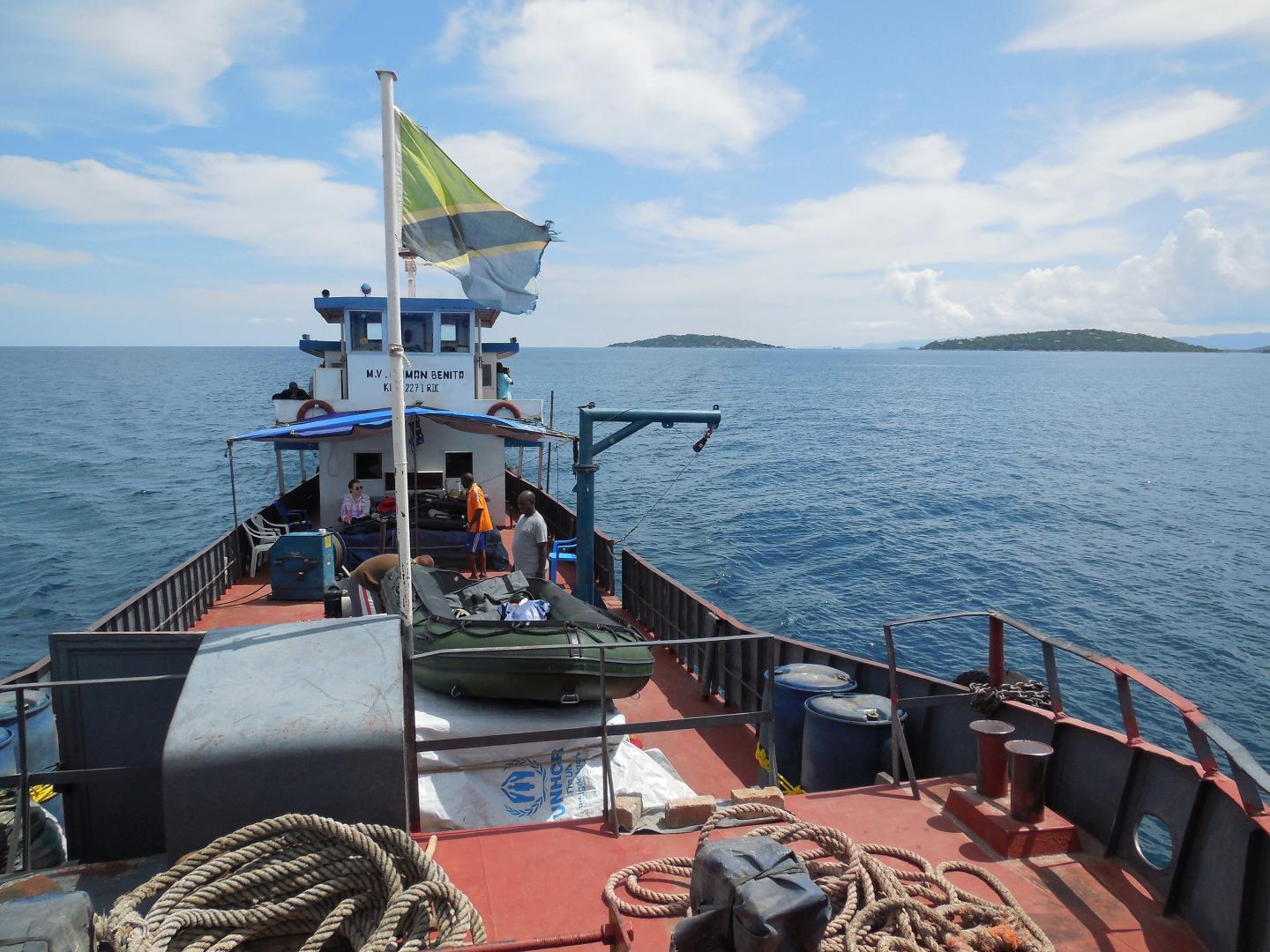 image: The research team spent 12 days on Lake Tanganyika collecting core samples from the lake's floor. They chartered a Congolese merchant vessel, seen here, and adapted it for their research project.