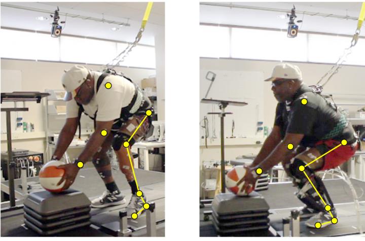 image: This image shows the study participant performing a squatting activity with different prosthetic devices. When the participant used his daily prosthesis (left picture) he had a limited range of motion and had to bend his back significantly to lift objects off the ground. When using a neural controlled prosthetic ankle (right picture) he was able to voluntarily control his prosthesis ankle joint force and angle and keep a healthy posture while lifting weight from the ground.