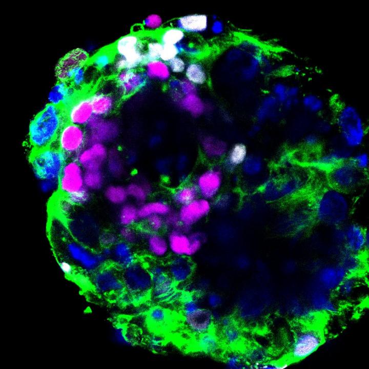 image: Image of a human embryo cultured in vitro through the implantation stages and stained to reveal OCT4 transcription factor, magenta; GATA6 transcription factor, white; F-actin, green; and DNA, blue. Analysis of patterns of gene expression in such embryos reveals that ACE2, the receptor for the SARS-CoV-2 virus, and the TMPRSS2 protease that facilitates viral infection are expressed in these embryos, which represent the very early stages of pregnancy.